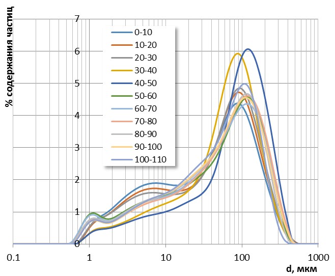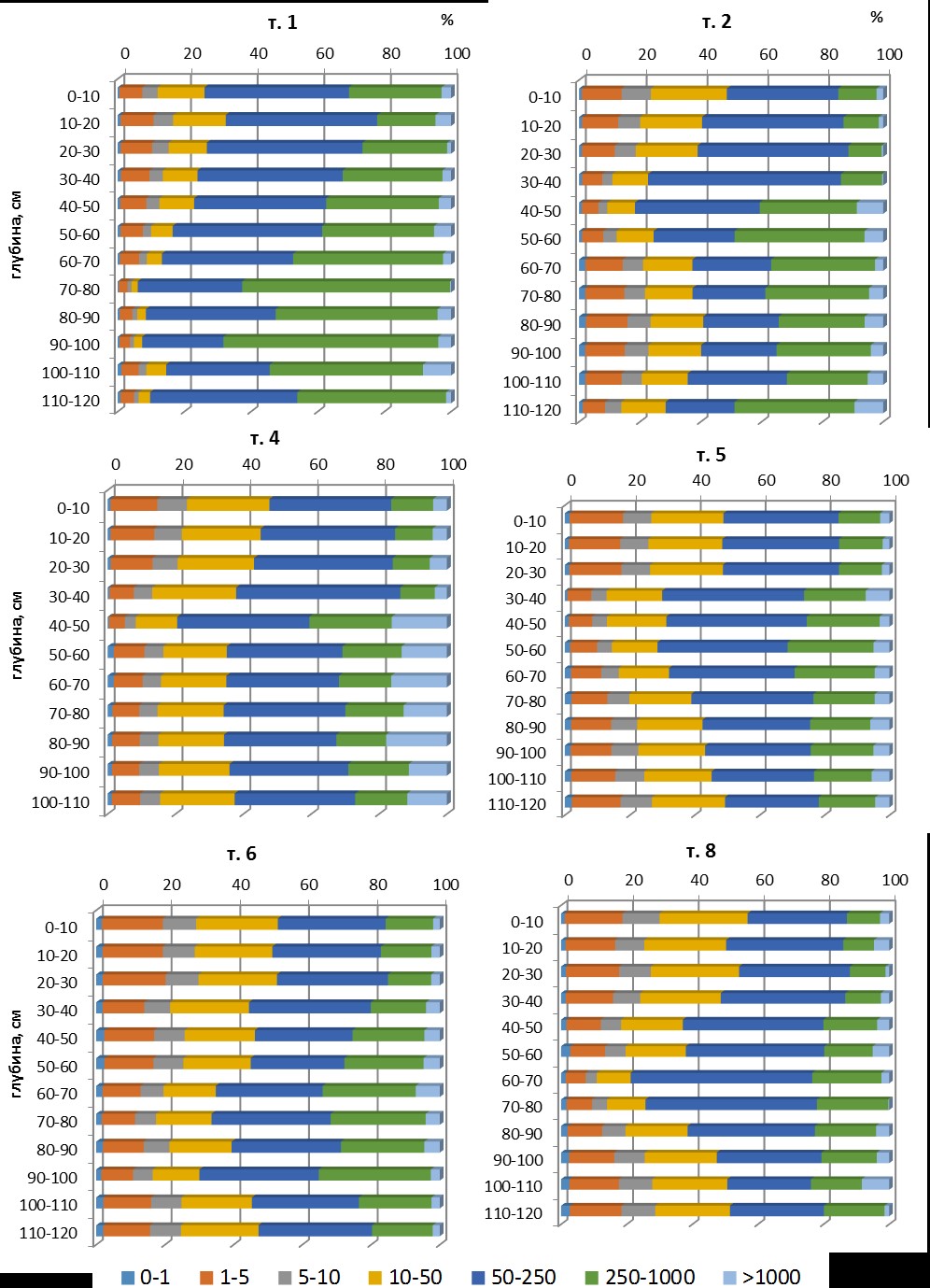 На опытном поле ВНИИМЗ (Тверская область, пос. Эммаусс) заложена серия из 8 почвенных разрезов. Первые три разреза южного склона приурочены к транзитно-аккумулятивному, транзитному и элювиально-транзитному микроландшафту с комплексом глееватых и глеевых почв, который меняется на элювиально-аккумулятивный плосковершинный участок и аналогичные микроландшафты северного склона со слабоогленными и глееватыми дерново-подзолистыми легкосуглинистыми почвами. В отобранных, через каждые 10 см, образцах методом лазерной дифракции и ситовым (>0.25 мм) методом определяли гранулометрический состав почв. На дифференциальных кривых распределения гранулометрических частиц преобладают фракции мелкого песка с максимумом содержания диаметров 100–150 мкм и пыли (1–50 мкм), а в профиле почв выделяются три гранулометрически однородных слоя: верхний с пахотным горизонтом (0–40 см), средний (до 70–80 см) и надморенный (до 120 см). В средней части профиля почв северного склона преобладают пылеватые фракции, а в почвах южной части ландшафта наблюдается сравнительно повышенное содержание песчаной фракции (преобладает фракция тонкого песка, 50–250 мкм, на втором месте фракция крупной пыли, 10–50 мкм), что, видимо, связано с историческими процессами формирования профилей на двучленных отложениях, эрозией и, возможно, с современными агротехнологическими процессами.